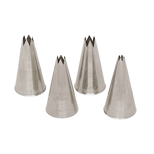 Насадки Атеко №820, 821, 822, 823 - шестиконечные открытые звёзды малого размера, верхний диаметр от 5 до 10 мм, высота около 50 мм, нижний диаметр около 25 мм.