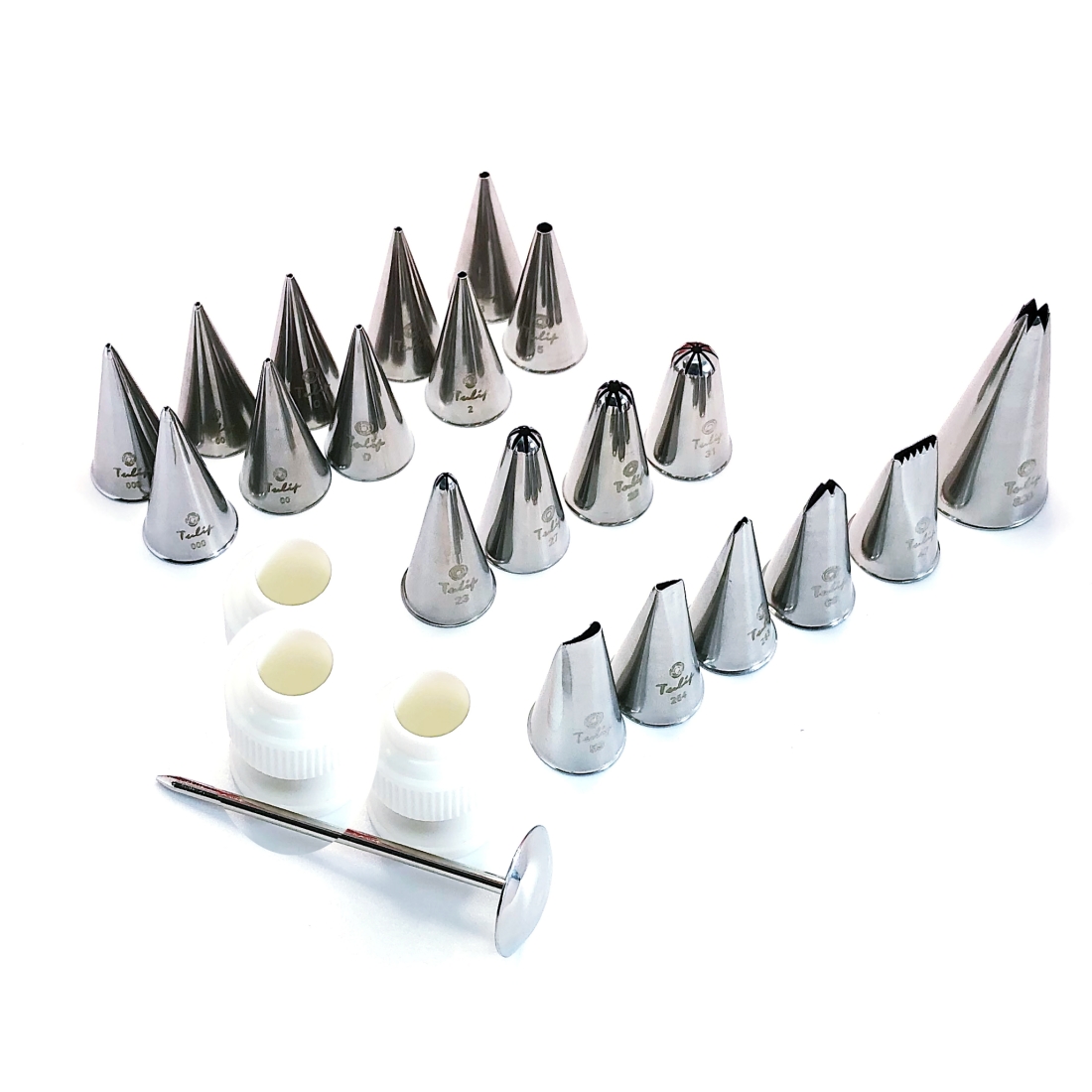 Кондитерские насадки в наборе маркированы номером и лого Ateco или Tulip, сделаны в Корее и имеют гарантию качества 10 лет.